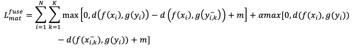 所有特征在计算前均进行L2归一化。为维持潜在空间内的相似性约束,作者设计了基于双向排序损失的匹配损失函数。为提高非匹配样本的代表性,在每个mini-batch中选取最不相似的K个负例。该损失旨在压缩匹配样本之间的距离,同时拉大非匹配样本之间的距离,从而提升匹配判别能力。具体公式如下所示: