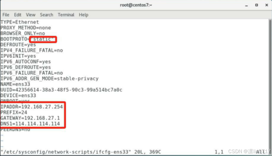 执行命令:vim /etc/sysconfig/network-scripts/ifcfg-ens33