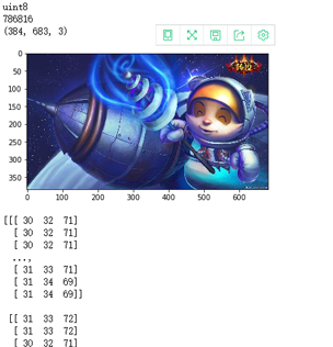 | 1 2 3 4 5 | #plt.imread读入的就是一个矩阵,跟opencv一样,但彩图读进的是RGB,与opencv有区别 print(image.shape) # (h,w,c) print(image.size) print(image.dtype) print(image) |