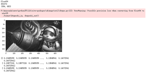 | 1 2 3 4 5 6 7 8 | im2 = io.imread('1.jpg',as_grey=True) #读入灰度图 print(im2.dtype) print(im2.size) print(im2.shape) io.imshow(im2) io.imsave('sk_gray.png',im2) io.show() print(im2) |