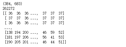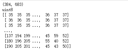 | 1 2 3 4 | arr_gray = np.array(gray) print(arr_gray.shape) print(arr_gray.dtype) print(arr_gray) |