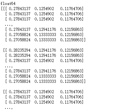 | 1 2 3 4 5 | #因为opencv读入的图片矩阵数值是0到255,有时我们需要对其进行归一化为0~1 img3 = cv2.imread('1.jpg') img3 = img3.astype("float") / 255.0 #注意需要先转化数据类型为float print(img3.dtype) print(img3) |
