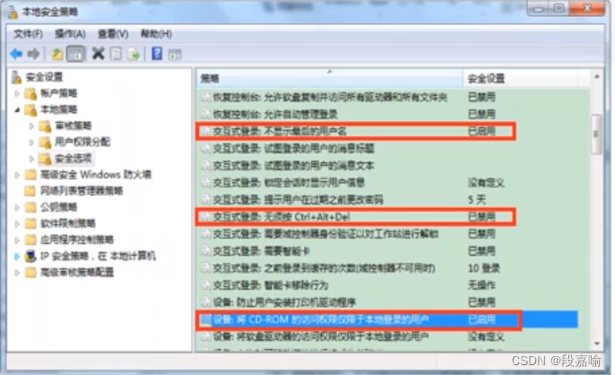 - 交互式登录:无须按Ctrl+Alt+Del,设置为已禁用