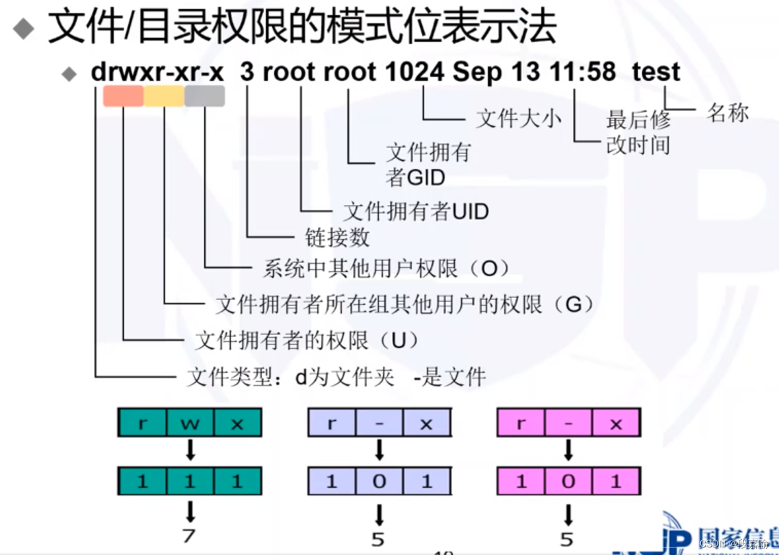 - 权限表示方式:模式位(UGO管理机制)