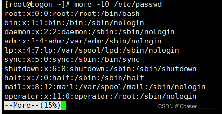 b.使用more/less查看/etc/passwd内容,且每页显示10行