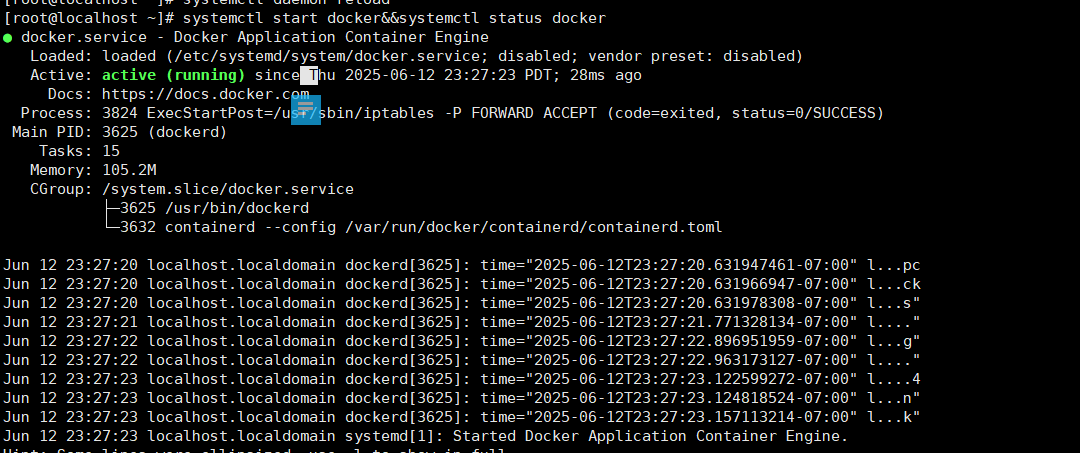 [root@localhost ~]# systemctl start docker&&systemctl status docker