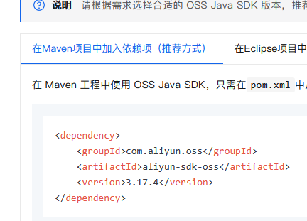 找到OSS Java SDK,然后在快速入门中找到安装,我们直接在Maven项目中安装,其实只是在pom.xml引入依赖。