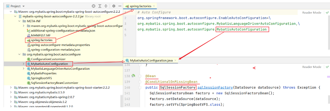 Mybatis提供了配置类,并且也提供了springboot会自动读取的配置文件。当SpringBoot项目启动时,会读取到spring.factories配置文件中的配置类并加载配置类,生成相关bean对象注册到IOC容器中。