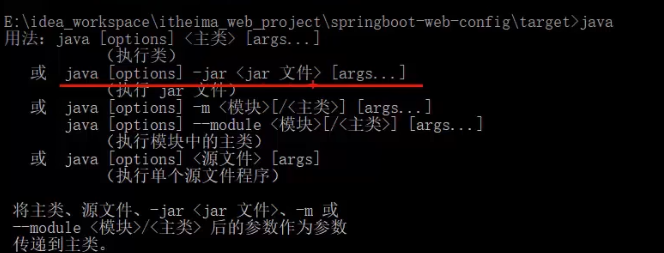 tips:打包之后在target的文件夹中找到jar包,直接在该目录下输入cmd,然后输入指令java,查看指令用法。