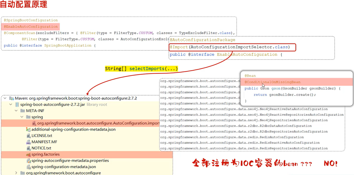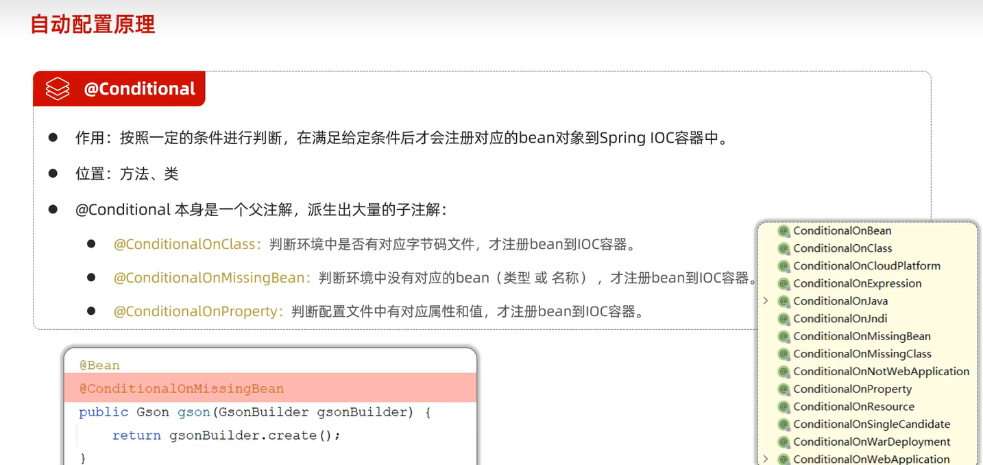 而前面我们也提到过这些所有的自动配置类当中,所有的 bean都会加载到 spring 的 IOC 容器当中吗?其实并不会,因为这些配置类当中,在声明 bean 的时候,通常会加上这么一类@Conditional 开头的注解。这个注解就是进行条件装配。所以SpringBoot非常的智能,它会根据 @Conditional 注解来进行条件装配。只有条件成立,它才会声明这个bean,才会将这个 bean 交给 IOC 容器管理。