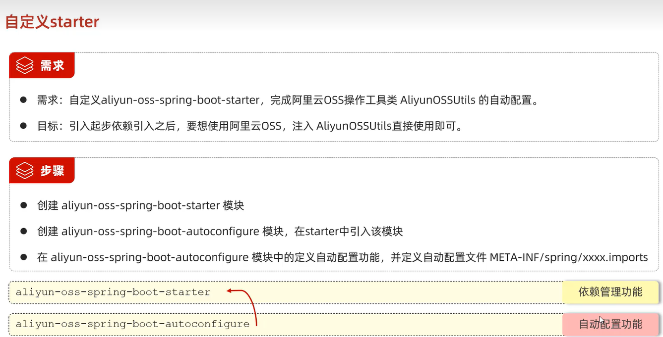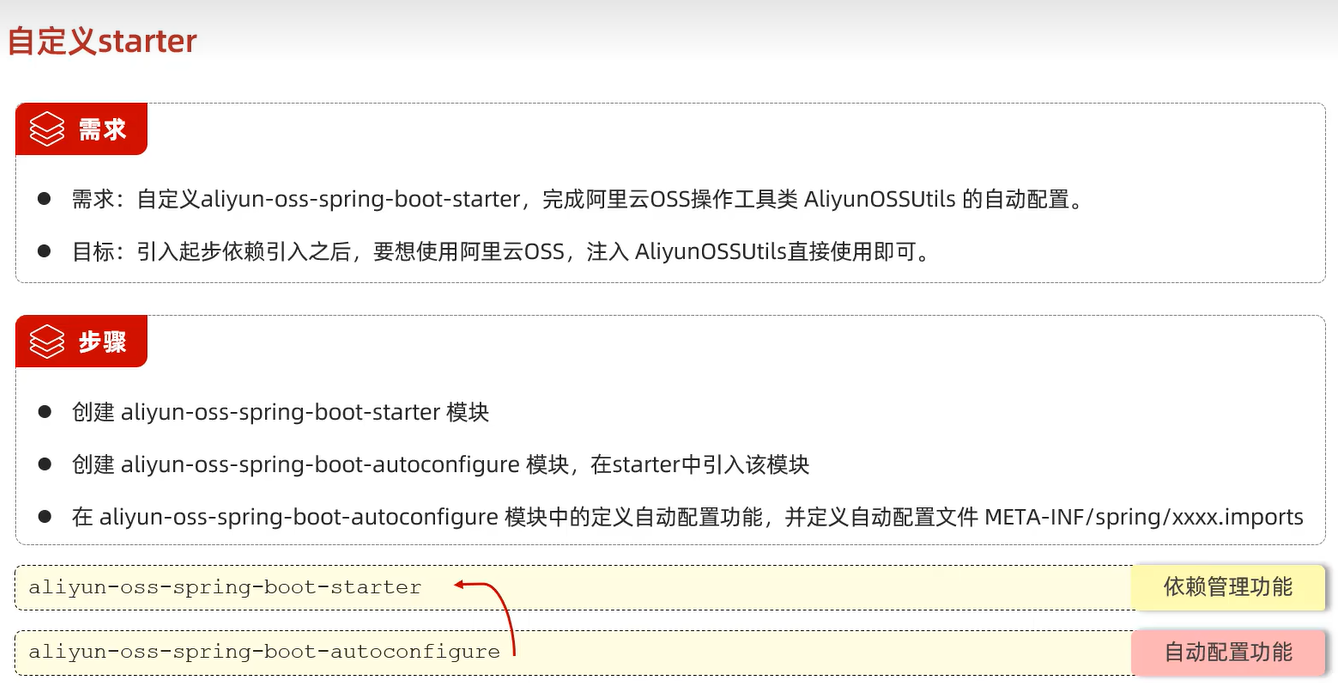 我们分析完自定义阿里云OSS自动配置的操作步骤了,下面我们就按照分析的步骤来实现自定义starter。