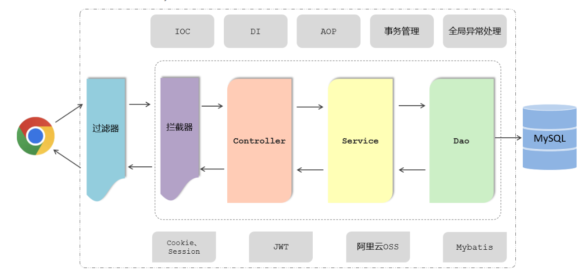 除了IOC与DI我们还讲到了AOP面向切面编程,还有Spring中的事务管理、全局异常处理器,以及传递会话技术Cookie、Session以及新的会话跟踪解决方案JWT令牌,阿里云OSS对象存储服务,以及通过Mybatis持久层架构操作数据库等技术。