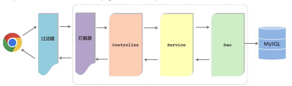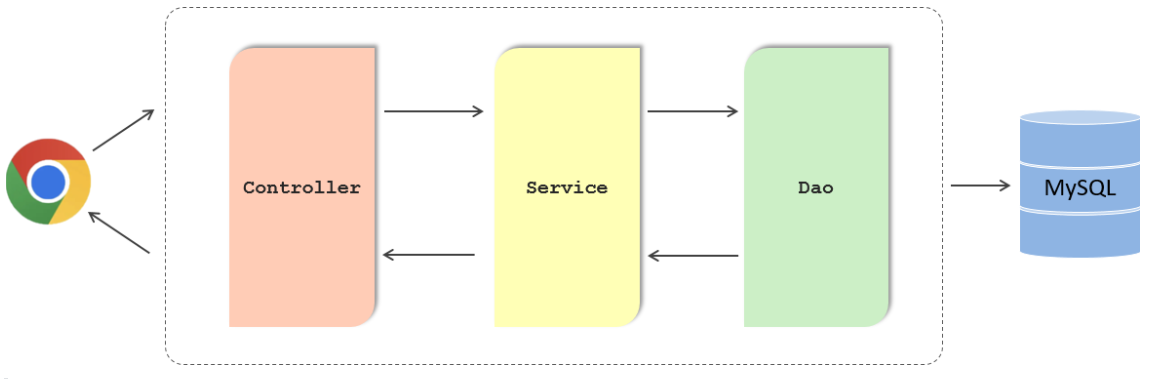 在三层架构当中,前端发起请求首先会到达Controller(不进行逻辑处理),然后Controller会直接调用Service 进行逻辑处理, Service再调用Dao完成数据访问操作。