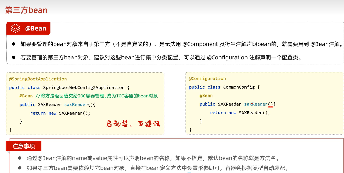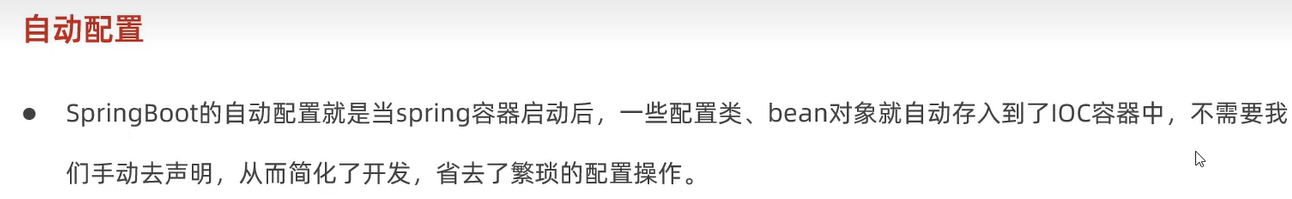 自动配置(AutoConfiguration):Spring Boot 根据依赖自动配置 Bean,无需手动配置。