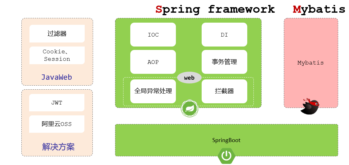 我们在学习这些web后端开发技术的时候,我们都是基于主流的SpringBoot进行整合使用的。而SpringBoot又是用来简化开发,提高开发效率的。像过滤器、拦截器、IOC、DI、AOP、事务管理等这些技术到底是哪个框架提供的核心功能?