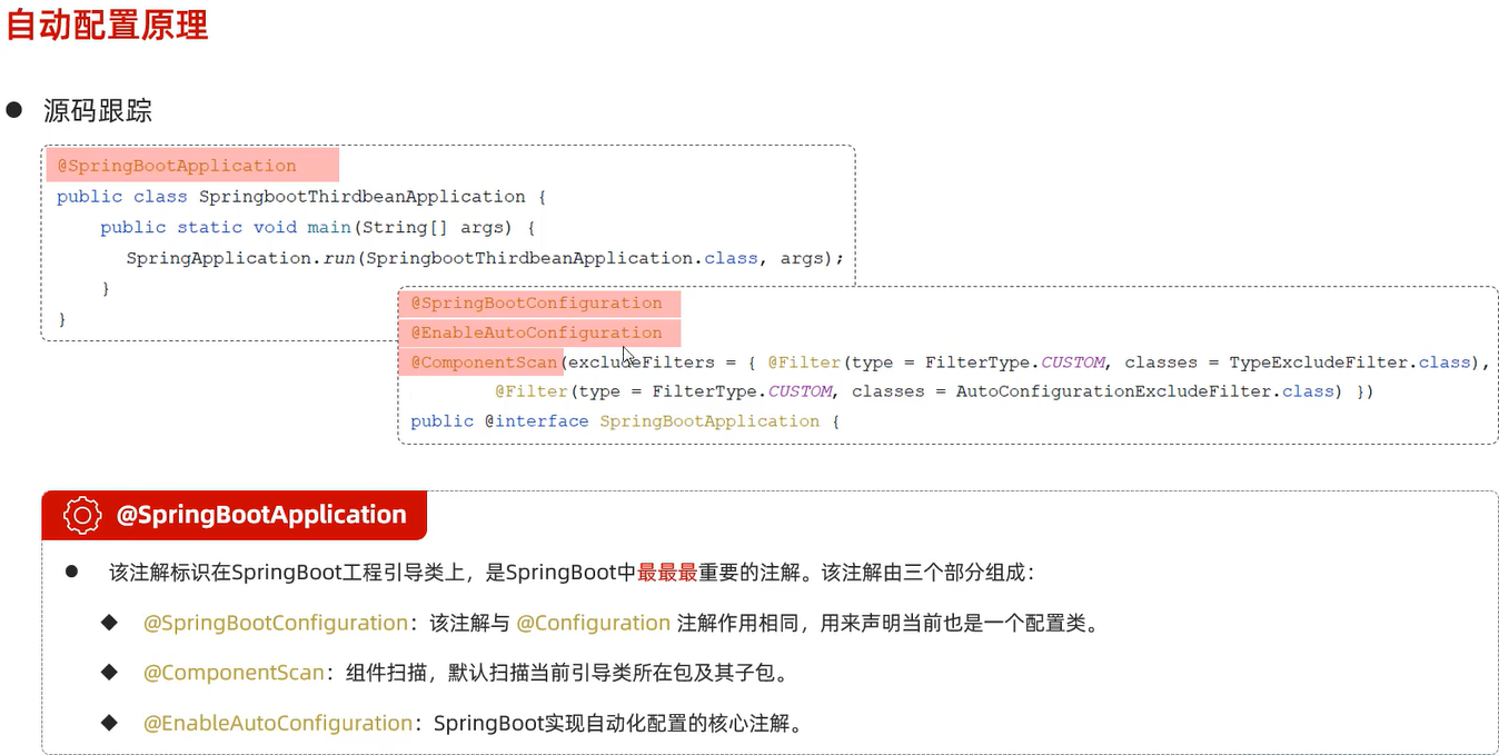 自动配置的核心就在@SpringBootApplication注解上,SpringBootApplication这个注解底层包含了3个注解,分别是: