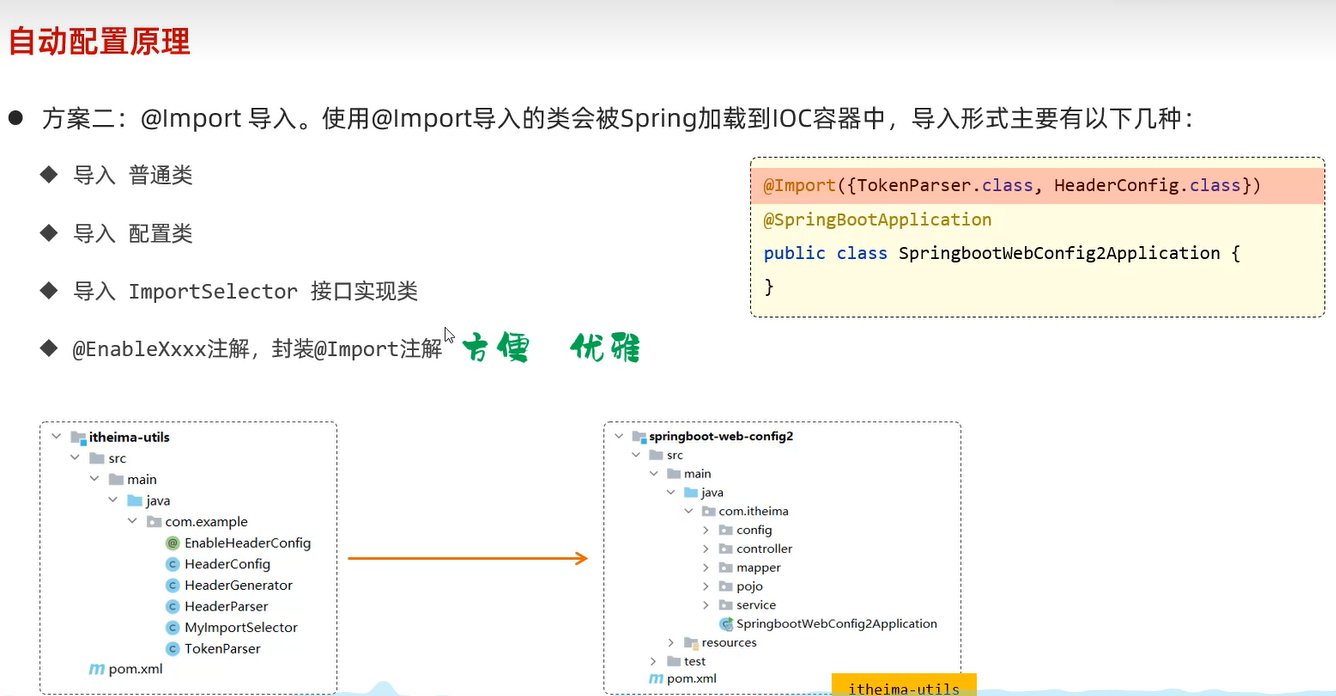 @Enable 开头的注解底层,它就封装了一个注解 import 注解,它里面指定了一个类,是 ImportSelector 接口的实现类。在实现类当中,我们需要去实现 ImportSelector 接口当中的一个方法 selectImports 这个方法。这个方法的返回值代表的就是我需要将哪些类交给 spring 的 IOC容器进行管理。