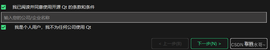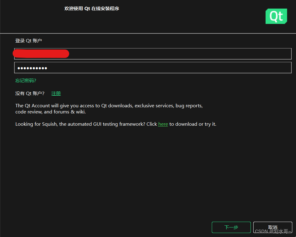 安装的第一步,是登录QT账号,没有的话就需要注册一个;之后点击下一步