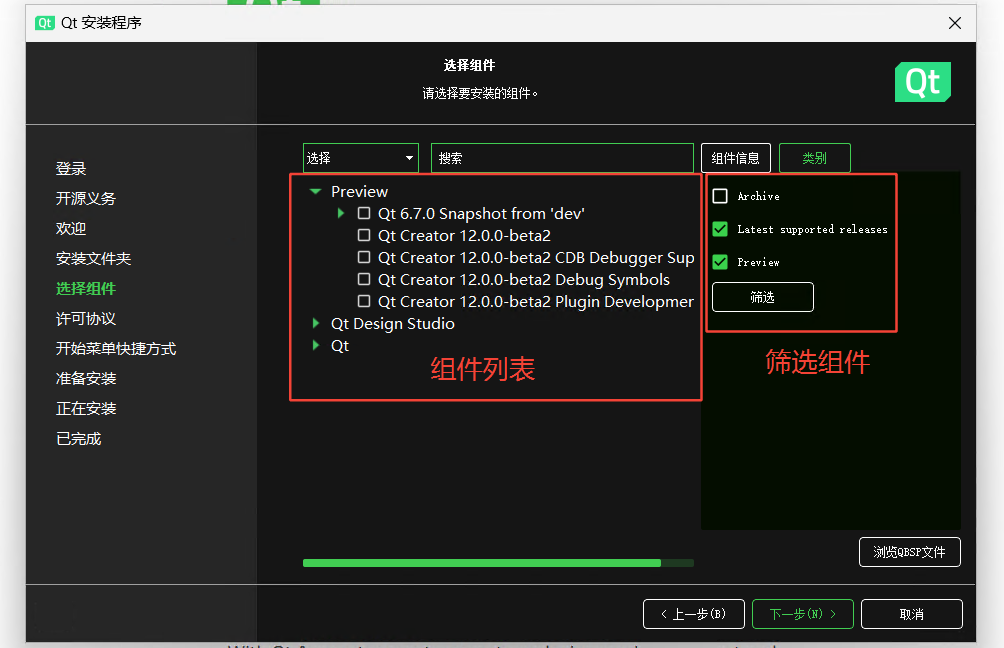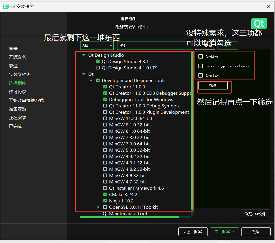- Qt Installer Framework,Qt安装框架,是给你的软件做安装包的,这个自己看,我一般不选,做不出来啥牛13的软件呗。