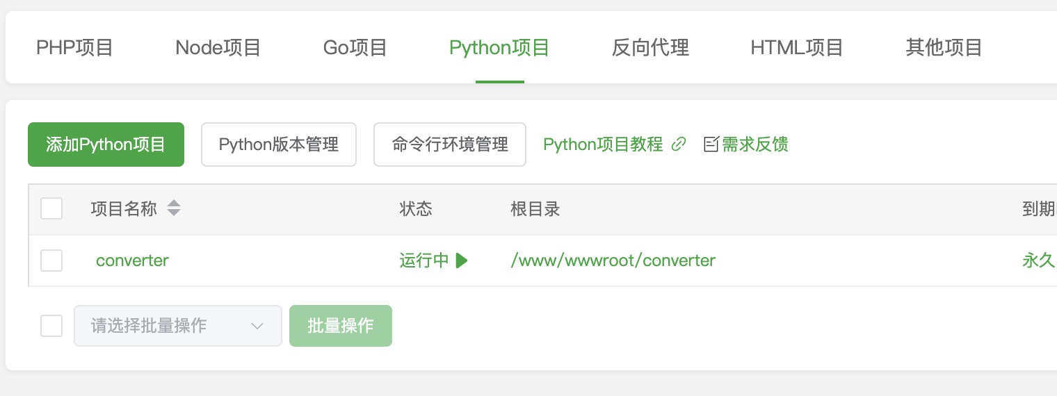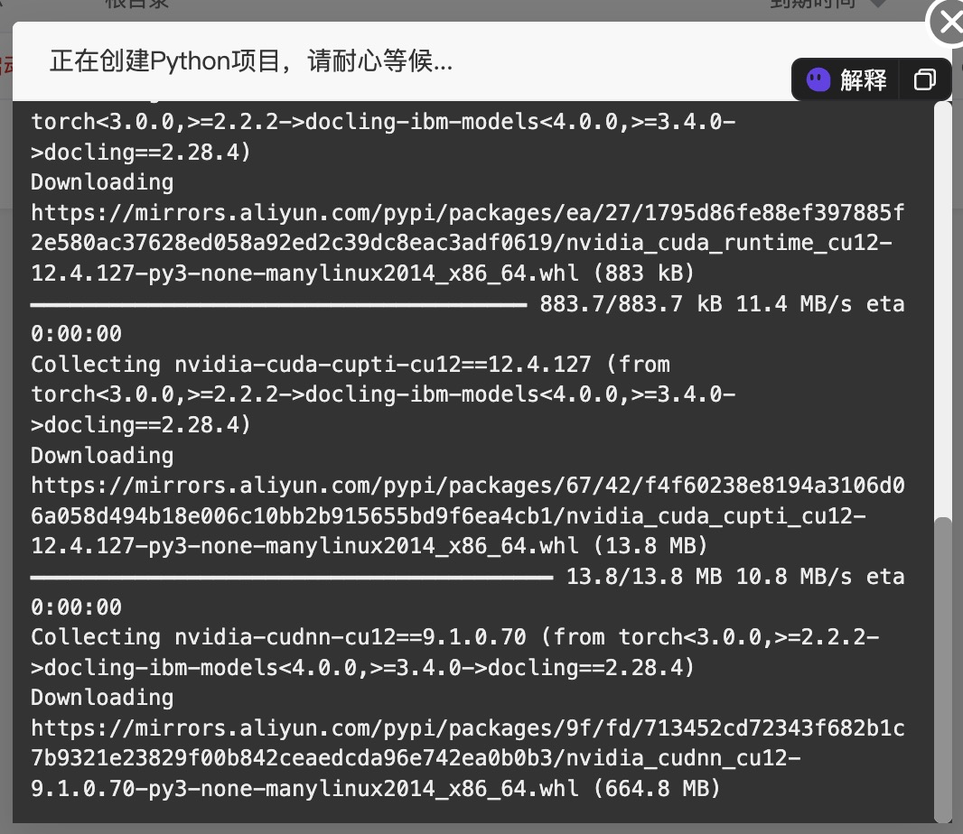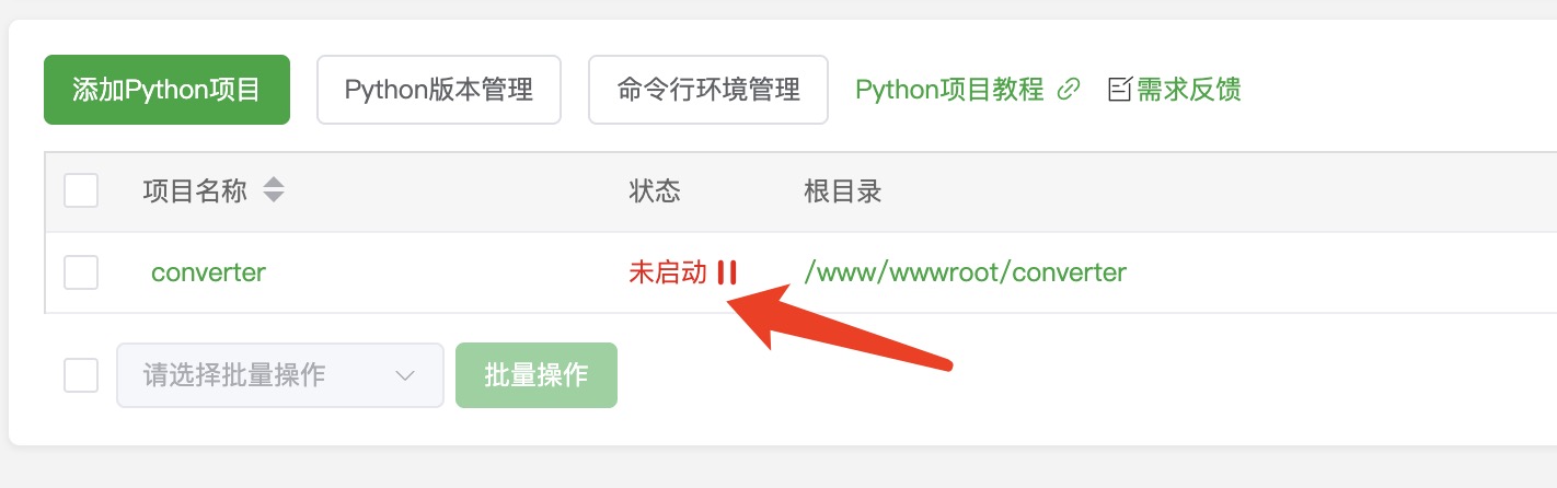 点击启动按钮后,会提示查看日志,此时程序在根据/www/wwwroot/converter下的requirements.txt内容,安装模块,点击项目后的设置按钮可查看安装进度,会很慢,大约会下载6G内容并安装,要耐心等待一段时间。