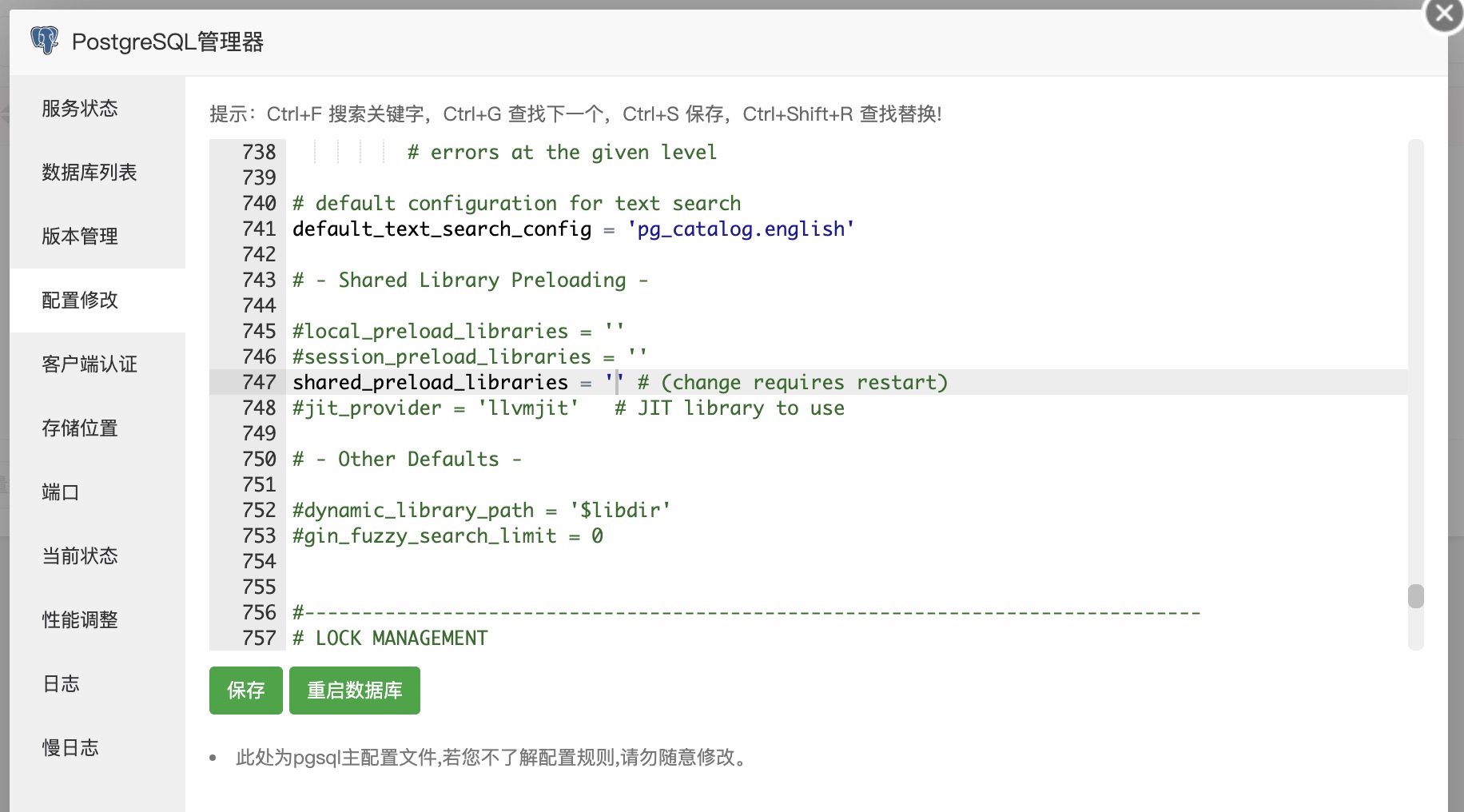 shared_preload_libraries = 'pg_prewarm,pg_stat_statements,pg_bigm,pg_search'
