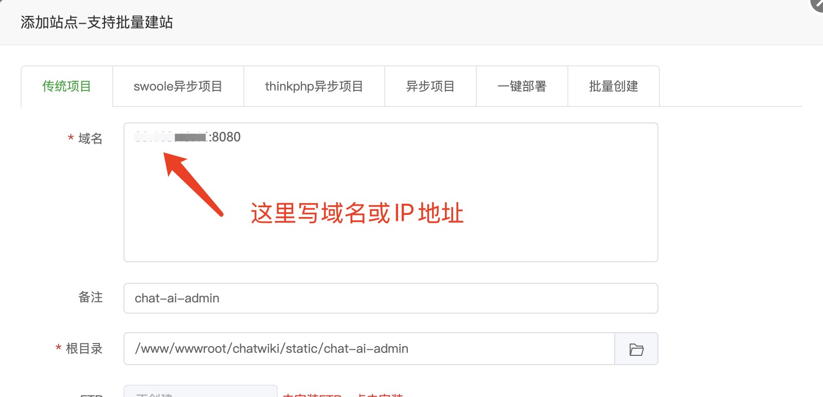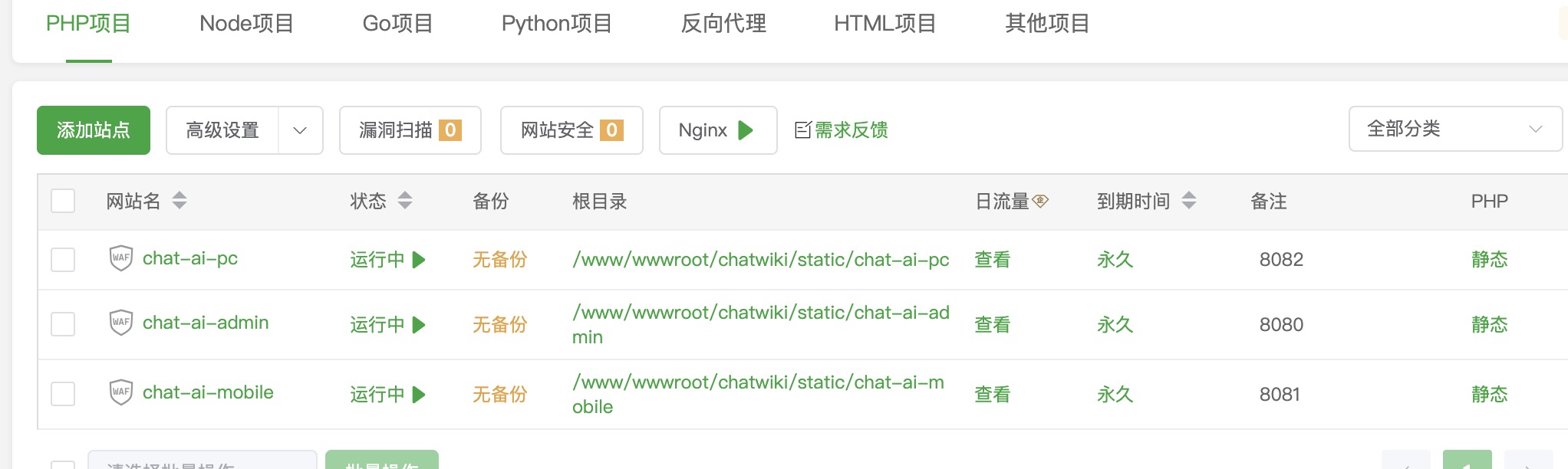 - 通过“IP+端口”的方式添加3个站点,分别是chat-ai-admin、chat-ai-mobile、chat-ai-pc