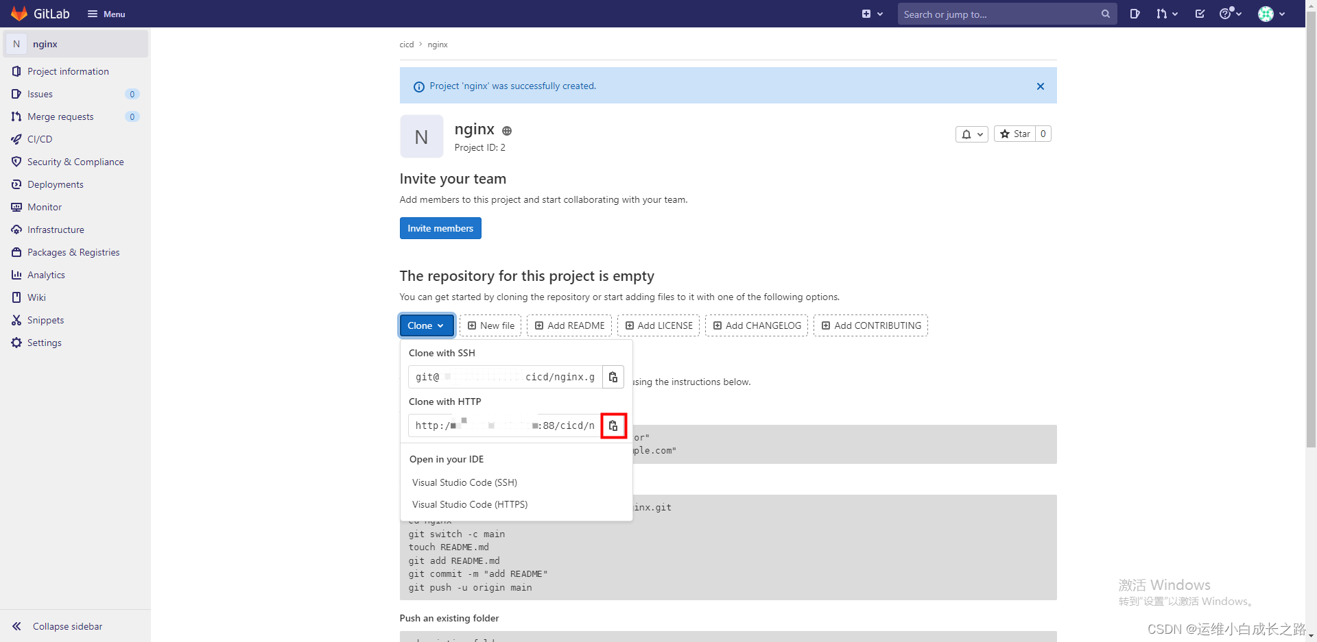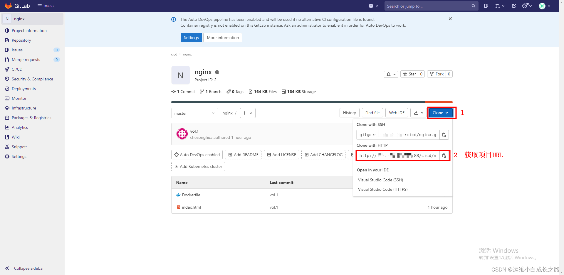 在gitlab的web页面上获取项目URL, 这里打码的地方是一个IP地址,按照文章逻辑来说应该是192.168.100.200