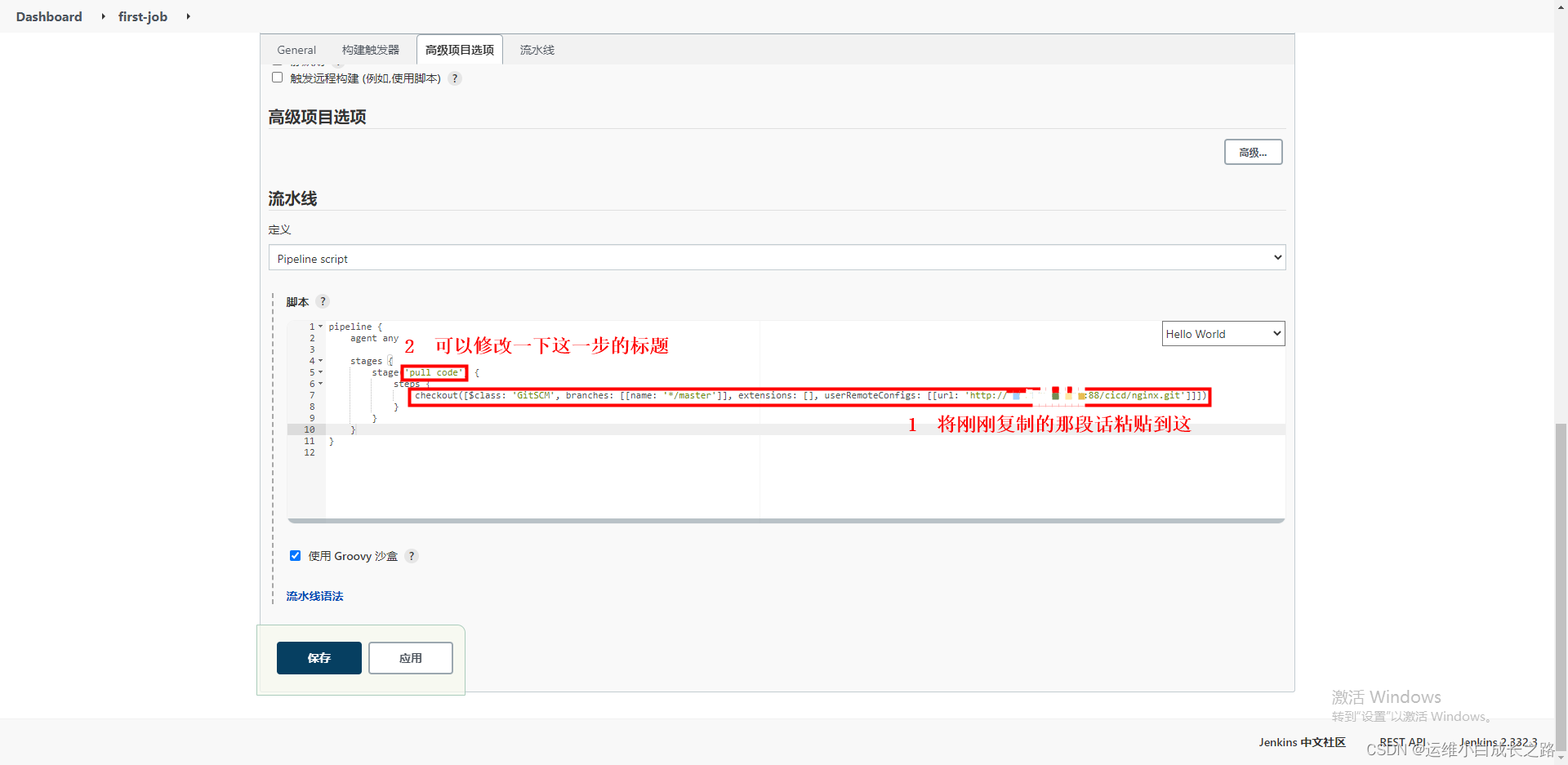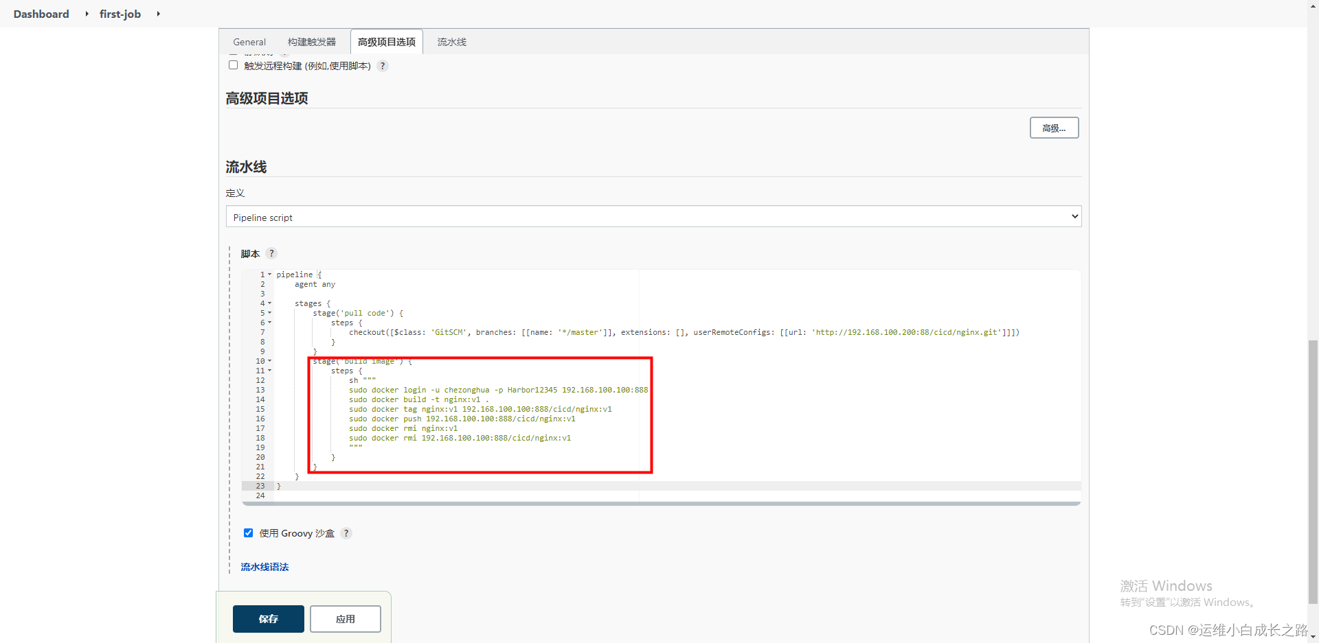 在原来的pipeline脚本基础上添加以下这段话,这个步骤作用是,登录先前创建的harbor仓库,构建镜像,改标签,上传镜像到harbor,删除本地镜像