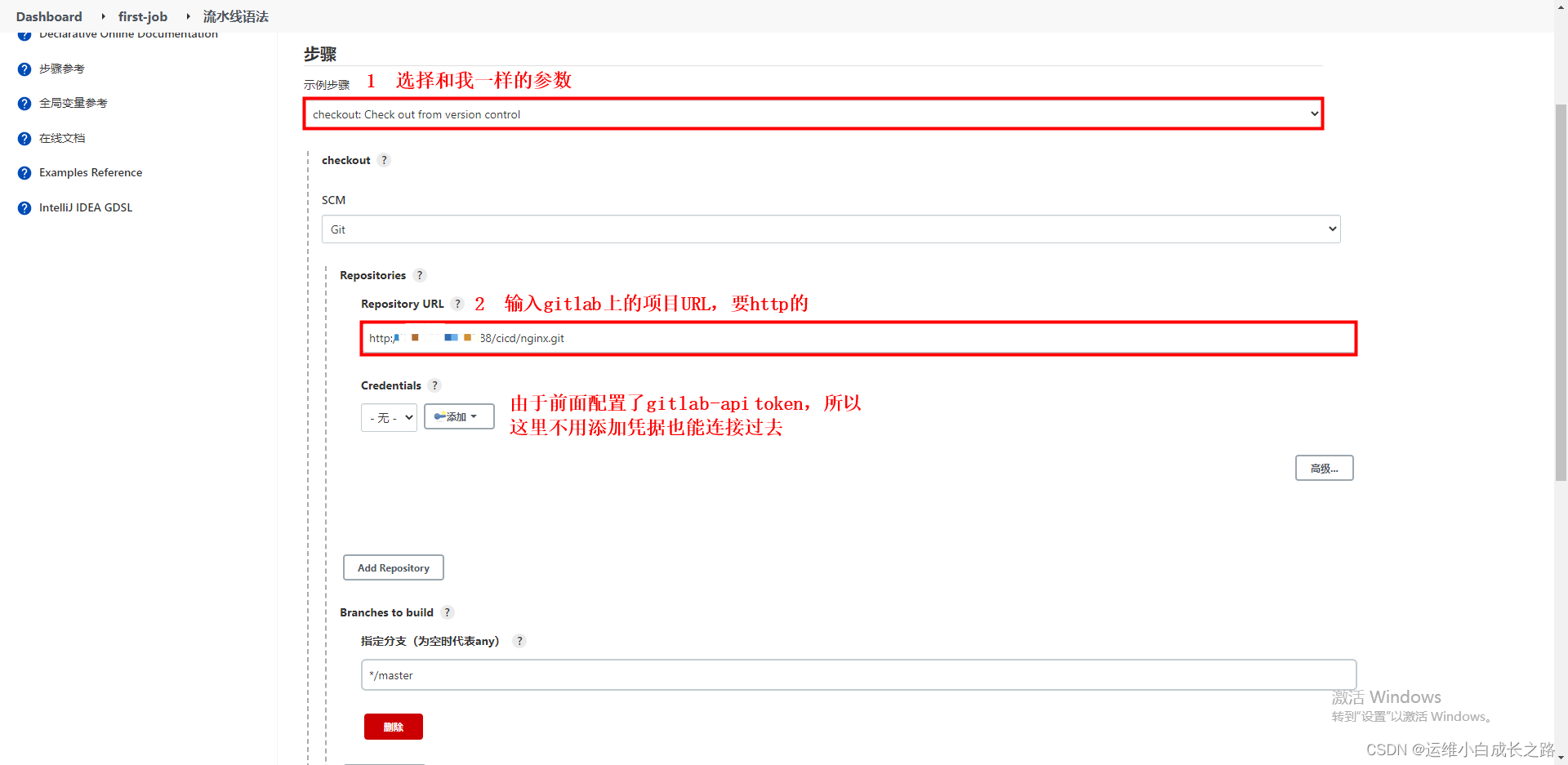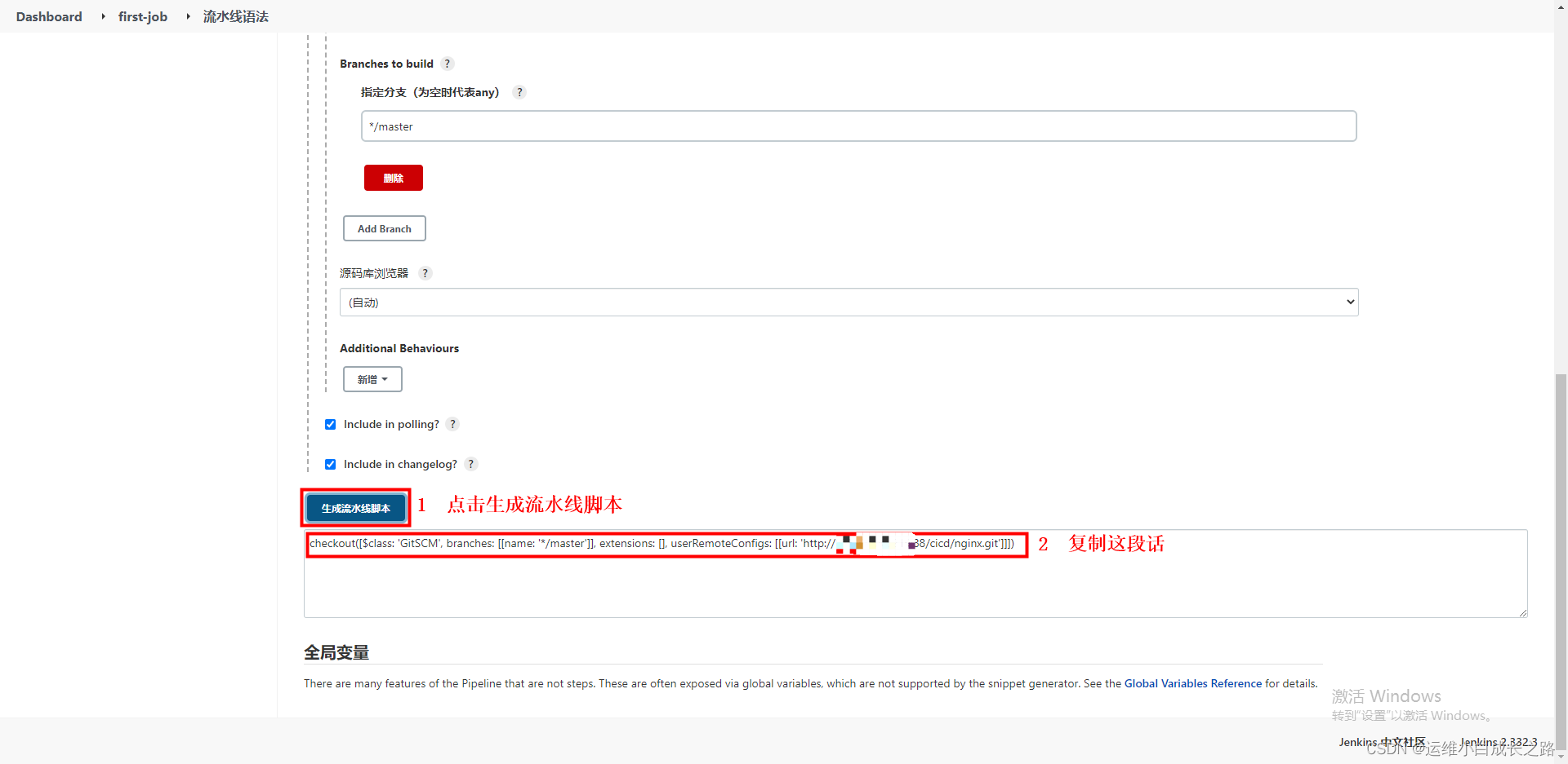 checkout([$class: 'GitSCM', branches: [[name: '*/master']], extensions: [], userRemoteConfigs: [[url: 'http://192.168.100.200:88/cicd/nginx.git']]])