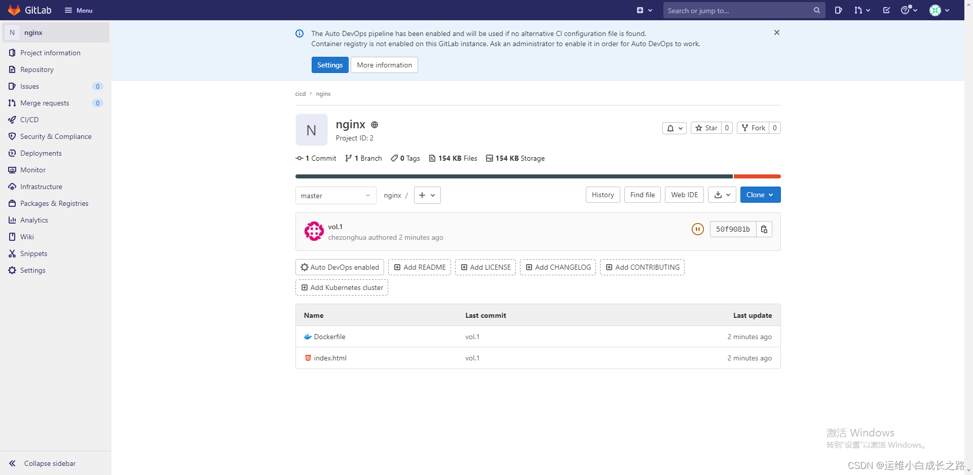 登录gitlab的web界面,可以看到刚刚上传的文件