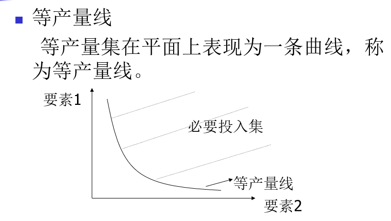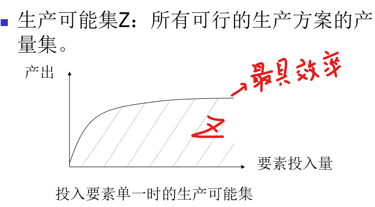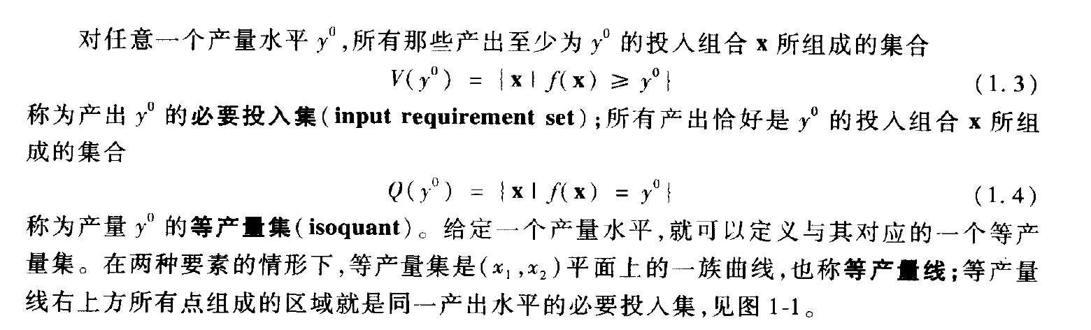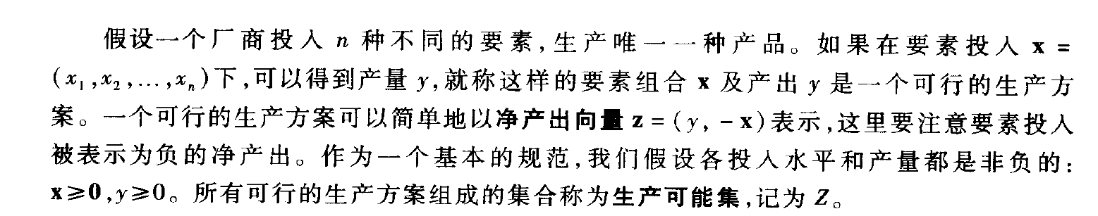 一、生产技术与生产函数 1、生产可能集 净产出向量Z=(y, -x) 曲线以上:因信息对称,所有个体效率均提升; 曲线以下:被淘汰。 2、生产函数 3、短期生产函数 部分要素可变;而长期生产函数所有要素可变。 4、必要投入集和等产量集 5、边际产出:一种要素变化,其他要素不变,对产量贡献如何? 6、技术替代率:产量不变,调整要素投入相对比重。