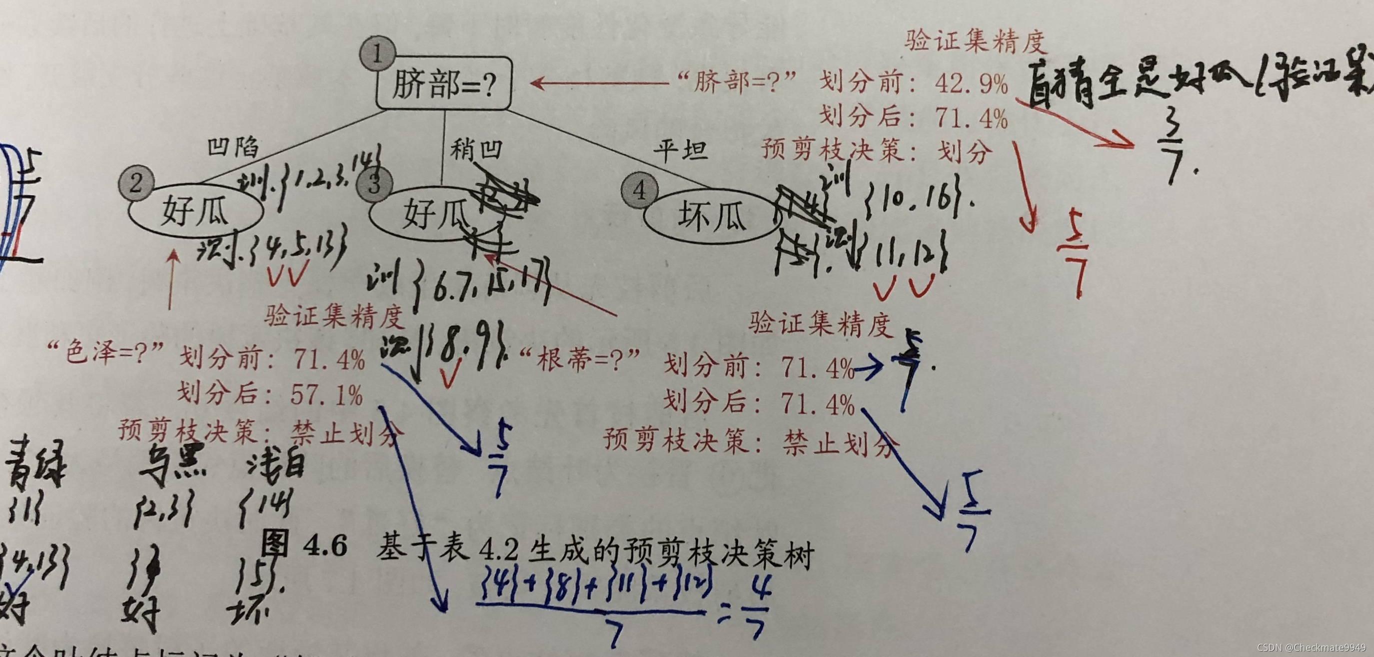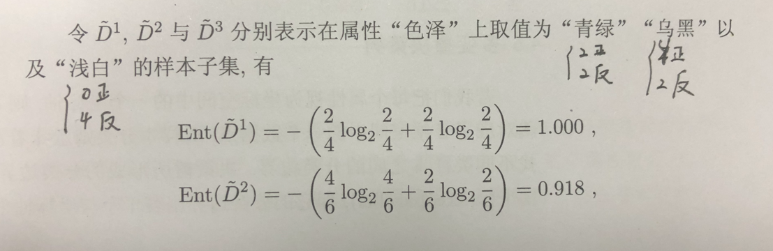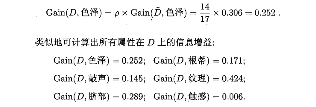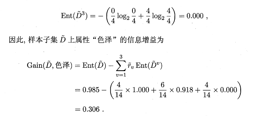 (2)根据属性“色泽”非缺失值的信息增益: