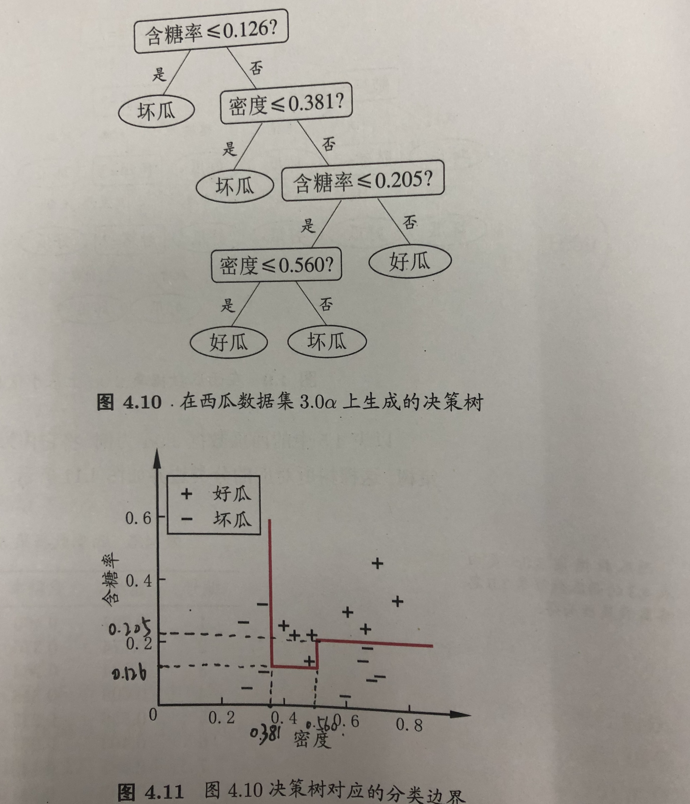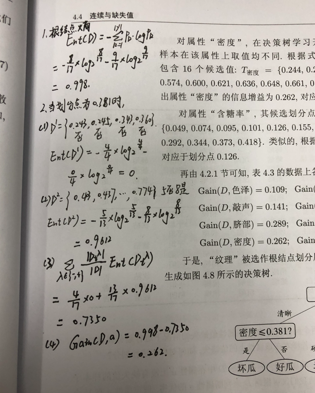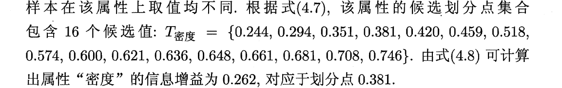 (2)根据每个候选划分点计算信息增益,计算得最大信息增益为0.262,对应于划分点0.381