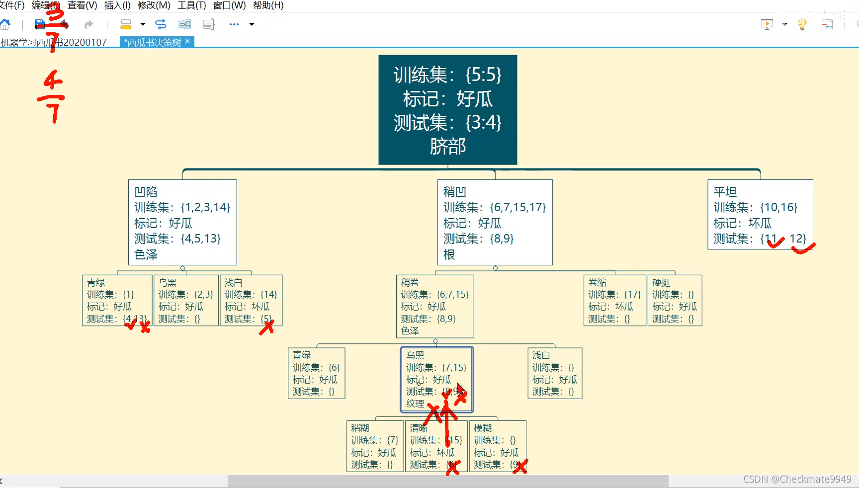 (1)根据属性“色泽”的14个非缺失值,计算“色泽”根节点熵:6个正例,8个反例