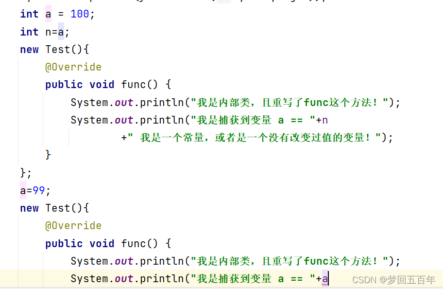 变量捕获(的变量a就是,捕获的变量。这个变量要么是被fifinal修饰,如果不是被fifinal修饰的 你要保证在使用之前,没有修改)