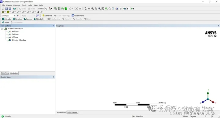 几何模型系统构建的方法可以分为2种。第一种,当绘制复杂模型时,可以采用专业的建模软件进行模型的绘制,绘制完成后导出为.x_t文件,之后将此文件导入wb中。专业建模软件例如:Solidwork、UG、CATIA、CORE。第二种,当绘制简单模型时,可以直接使用wb中DesignModeler简称“DM界面”进行绘制。或者从外部导入模型后,在DM中进行模型的简单处理,如:Slice(分割)、Enclosure(外流场)等。下图为DM界面: