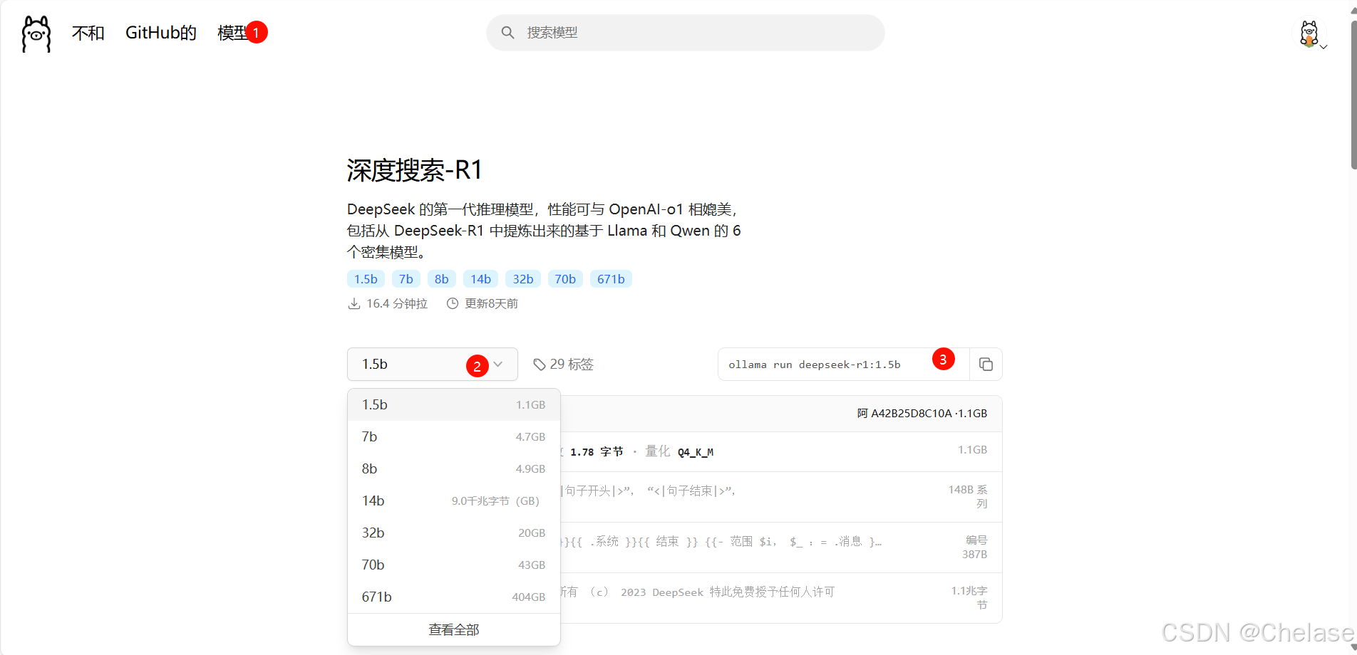 由于不同的deepseek模型需要不同的配置要求,这里根据自己的配置进行选择。也可以前往huggingface自行挑选模型