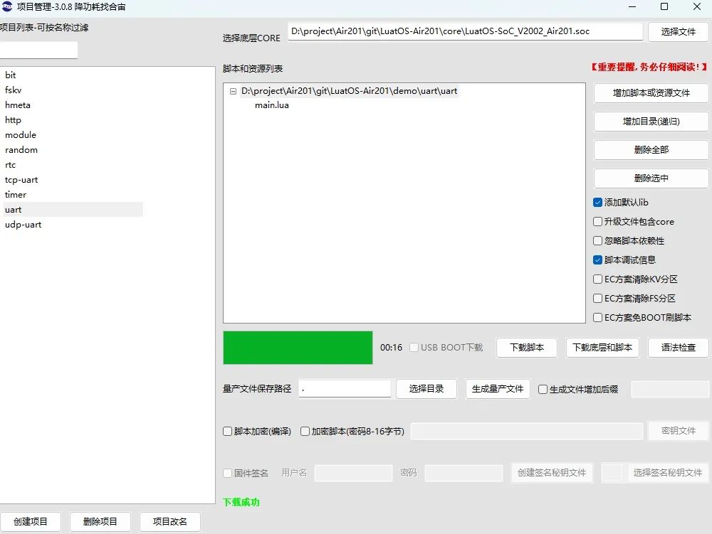 可以在LuaTools项目管理中新建一个项目,重新选择底层CORE和脚本;或者在原有项目的基础上,不更换CORE,将原来的脚本删除,添加为demo/uart的脚本。