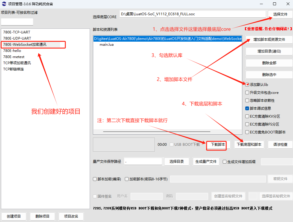 选择780E板子对应的底层core和刚改的main.lua脚本文件。下载到板子中。