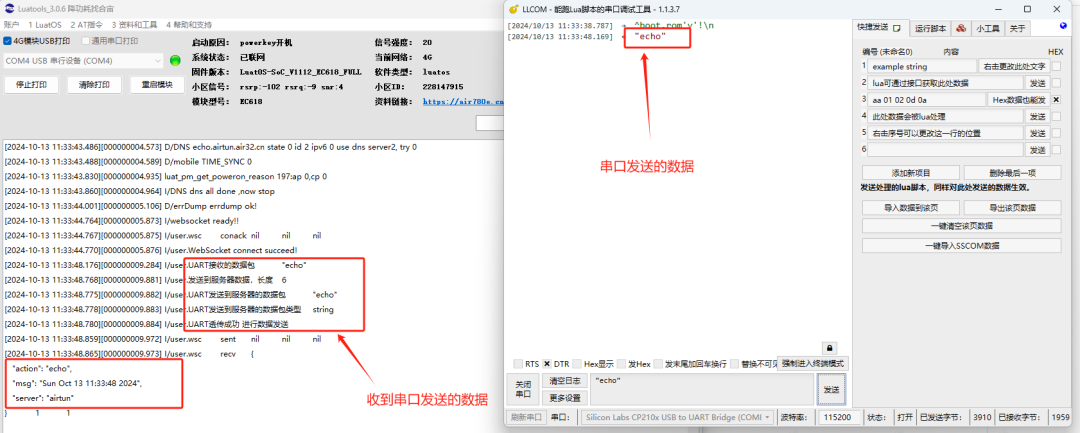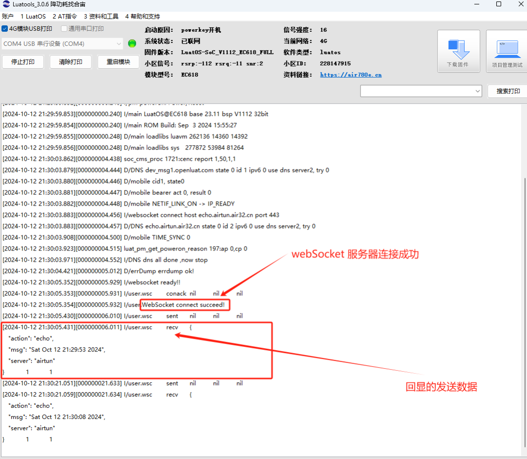 这是个测试服务,当4G模组发送的是json,且action=echo,就会回显所发送的内容