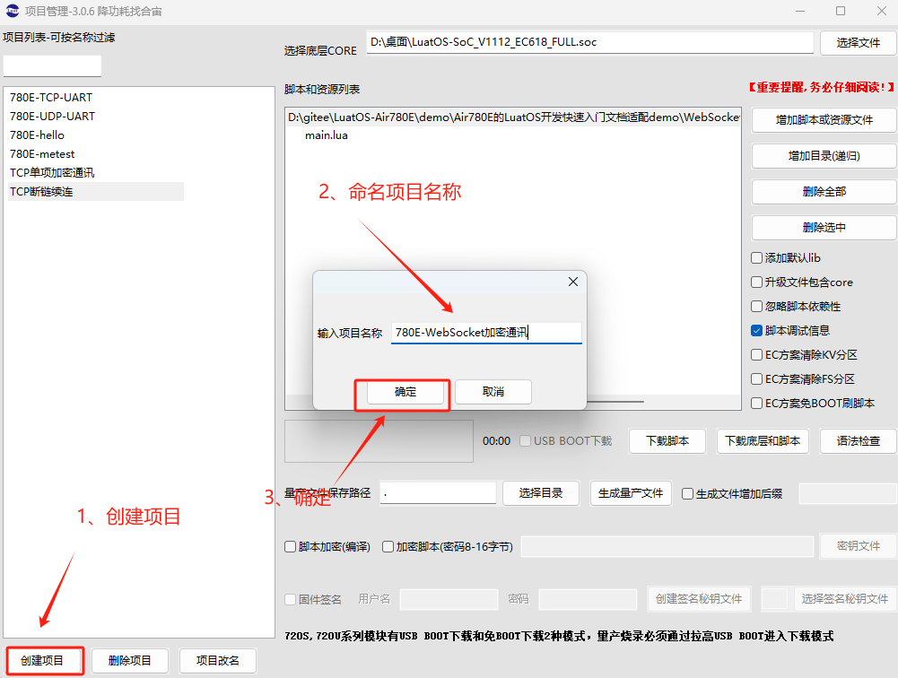 首先要说明一点:脚本代码,要和固件的LuatOS-SoC_V1112_EC618_FULL.soc文件一起烧录。
