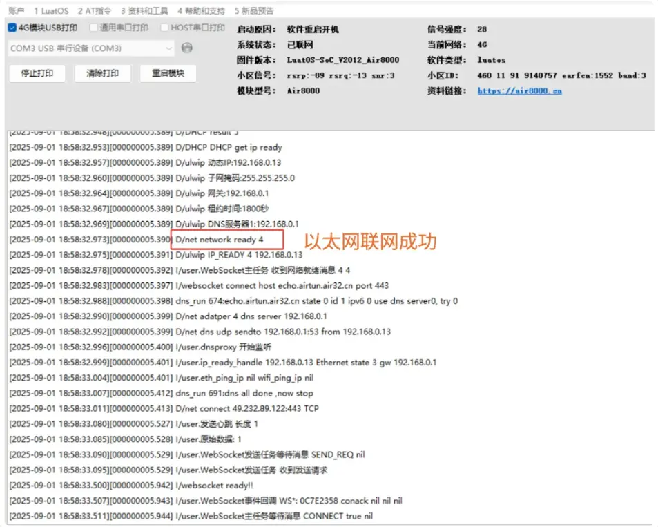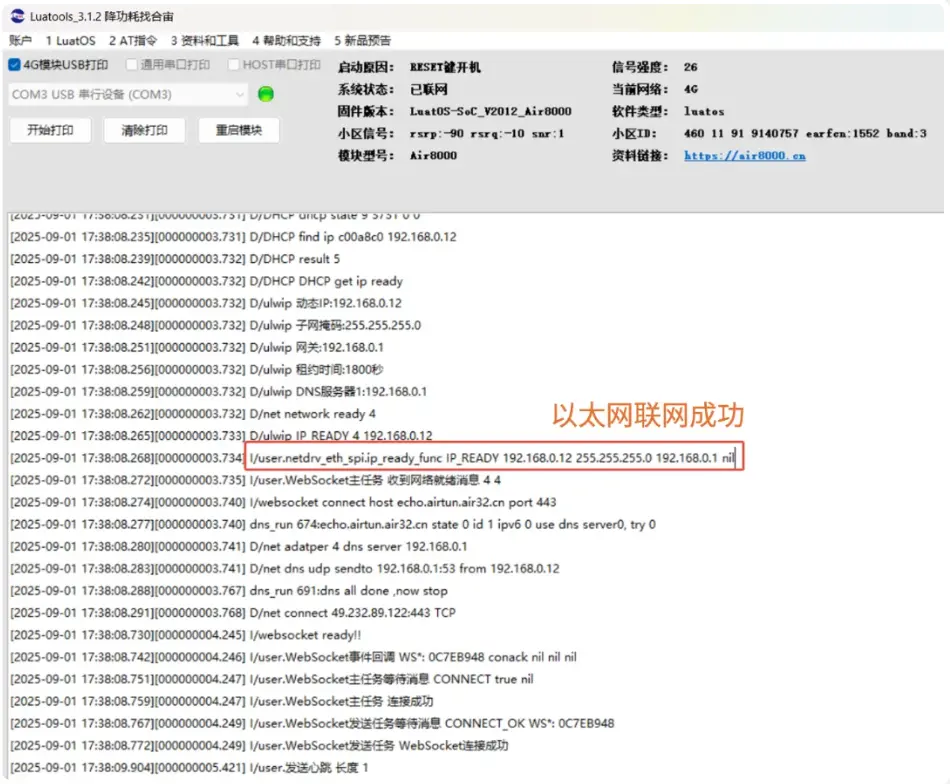 LuaTools工具日志打印如下图所示,如出现类似日志,则表示以太网联网成功。
