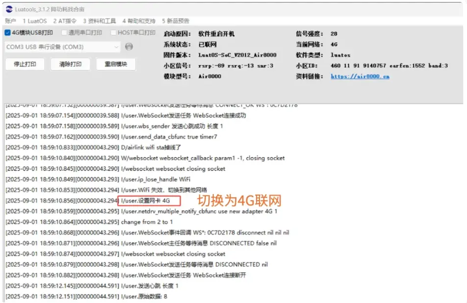 LuaTools工具日志打印如下图所示,如出现类似日志,则表示4G网卡连接成功。