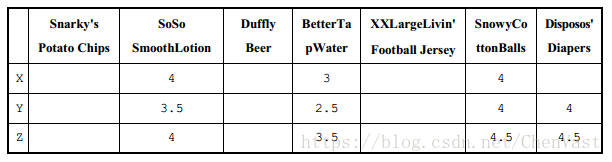 我们将从被称为效用矩阵(utility matrx)的东西开始。它和词条-文档矩阵相类似,不过这里我们表示的是产品和用户,而不再是词条和文档。