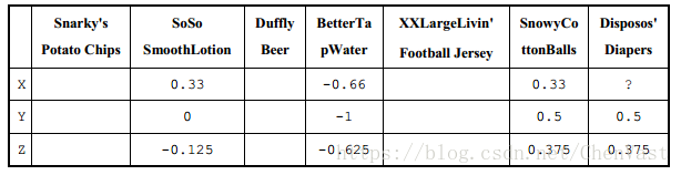 想知道用户 X 会给 Disposos' Diapers 打多少分。我们可以根据用户评分中心化之后的余弦相似度获得权重,并通过这些权重对用户 Y 和用户 Z 的评分进行加权计算。