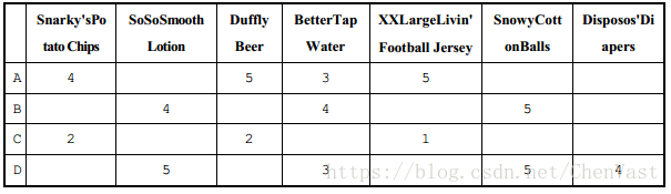 这里,我们假设有顾客 A 到 D,以及他们所评分的一组产品,评分从 0 到 5