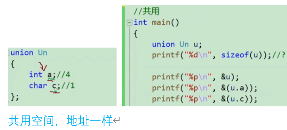 联合的成员是共用同一块内存空间的,这样一个联合变量的大小,至少是最大成员的大小(因为联合至少得有能力保存最大的那个成员)。