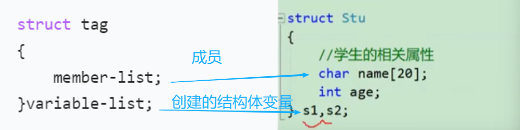 结构体变量也可以通过结构体类型创建,如:struct tag S={"zhangsan","12"};