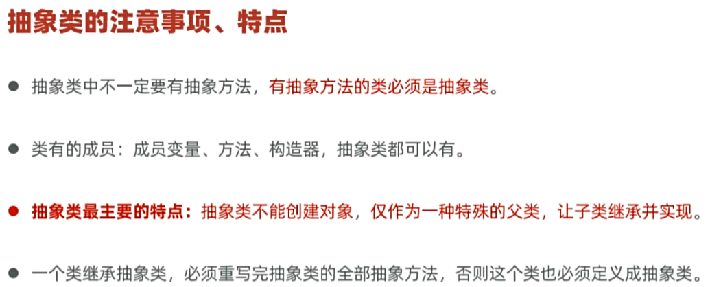// 抽象方法:必须用 abstract 修饰,只有方法签名,不能有方法体