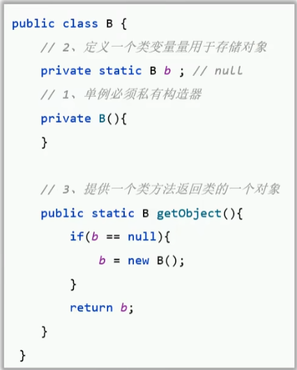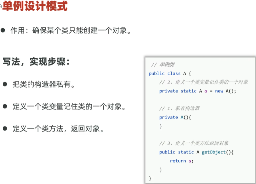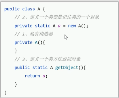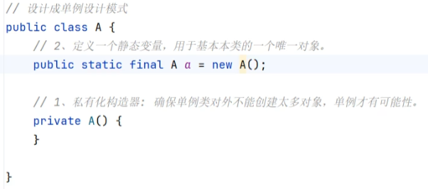 注:为了不把A类的唯一对象弄丢(例如:A.a = null),需设计为以上两种示例方式的任意一种来防止对象改变。